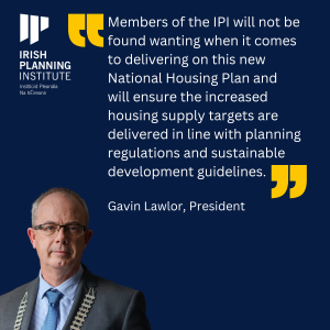 “I welcome the publication of the government’s new National Housing Plan, which sets out an ambitious target for housing delivery up to 2030 and beyond. As professional planners, members of the IPI are at the coalface of housing delivery in this country, including identifying suitable lands for housing development and preparing and assessing applications for new residential projects.